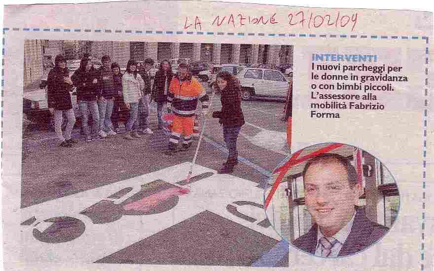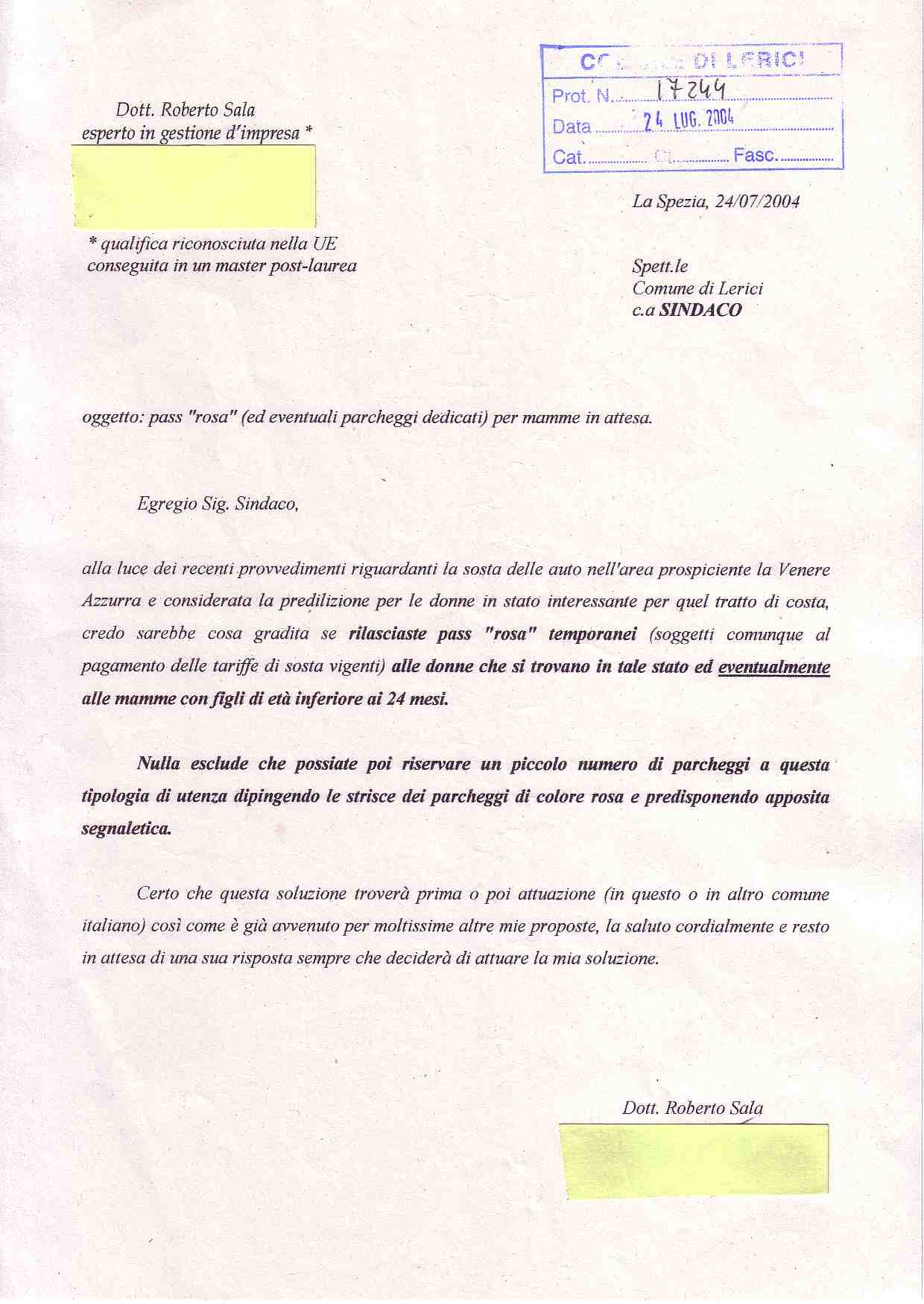 Il 24 luglio 2004 (anticipando di quattro anni la prima realizzazione di simili soluzioni nella mia provincia) suggerii al Comune di Lerici (con lettera protocollata) l'adozione di parcheggi, colorati di rosa, riservati alle mamme in attesa e/o con bimbi in tenera età.